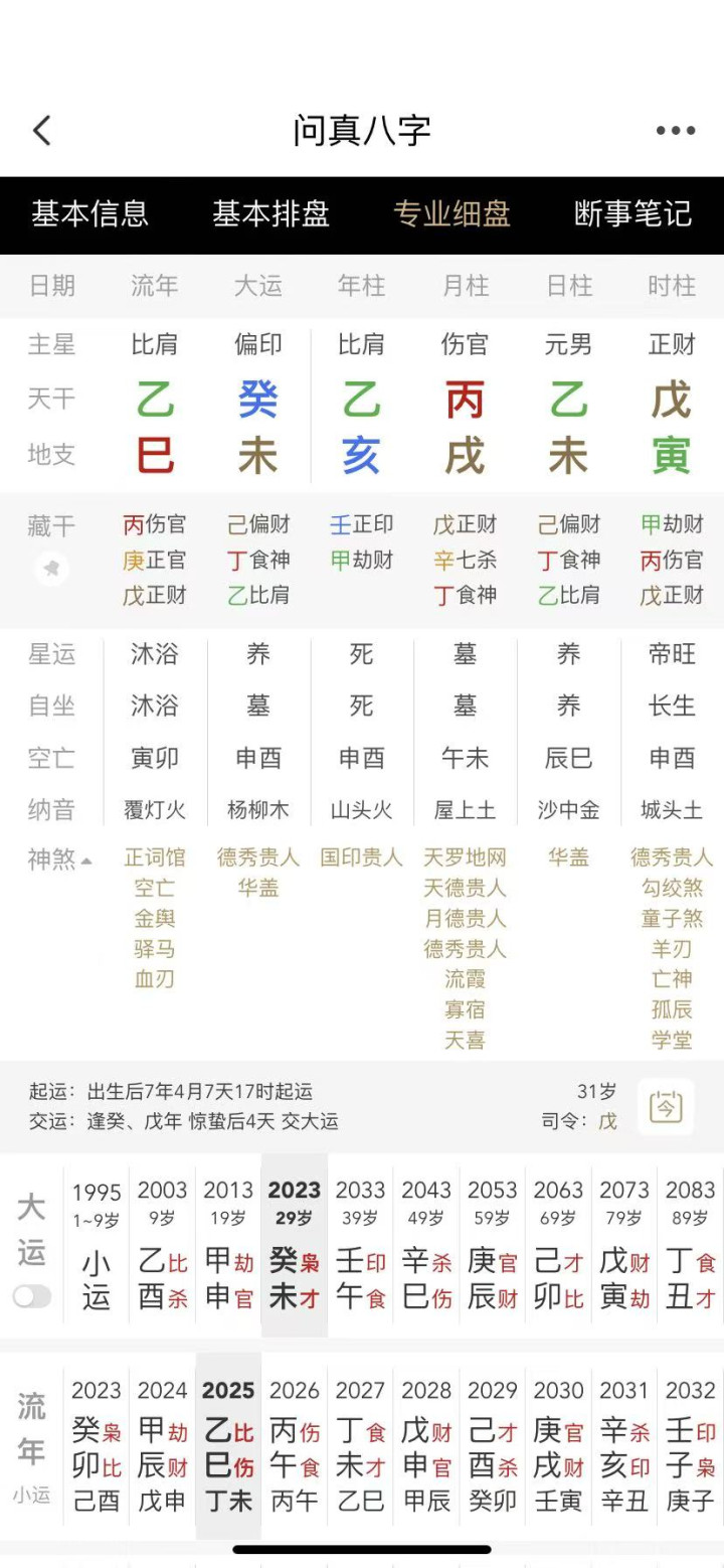 现在走的是癸未大运,此大运未土财星克印,运势走低。之后的壬午大运,地支午火旺了财星,运势一般。辛巳大运,乙辛相冲,巳亥相冲,寅巳相害,用神均有损,比较低谷。